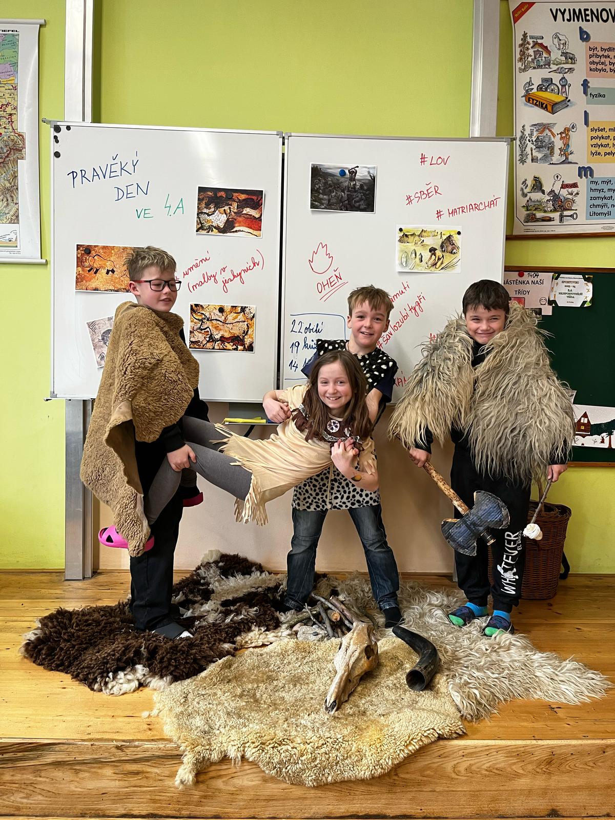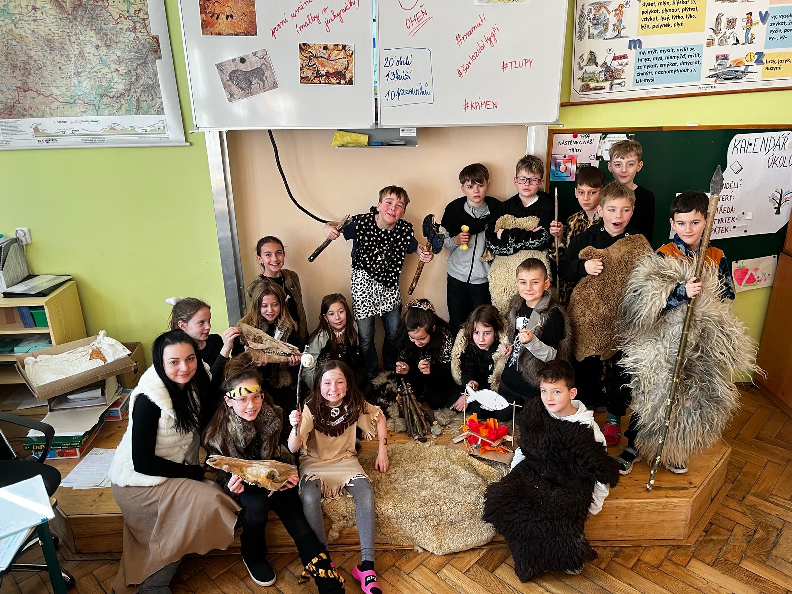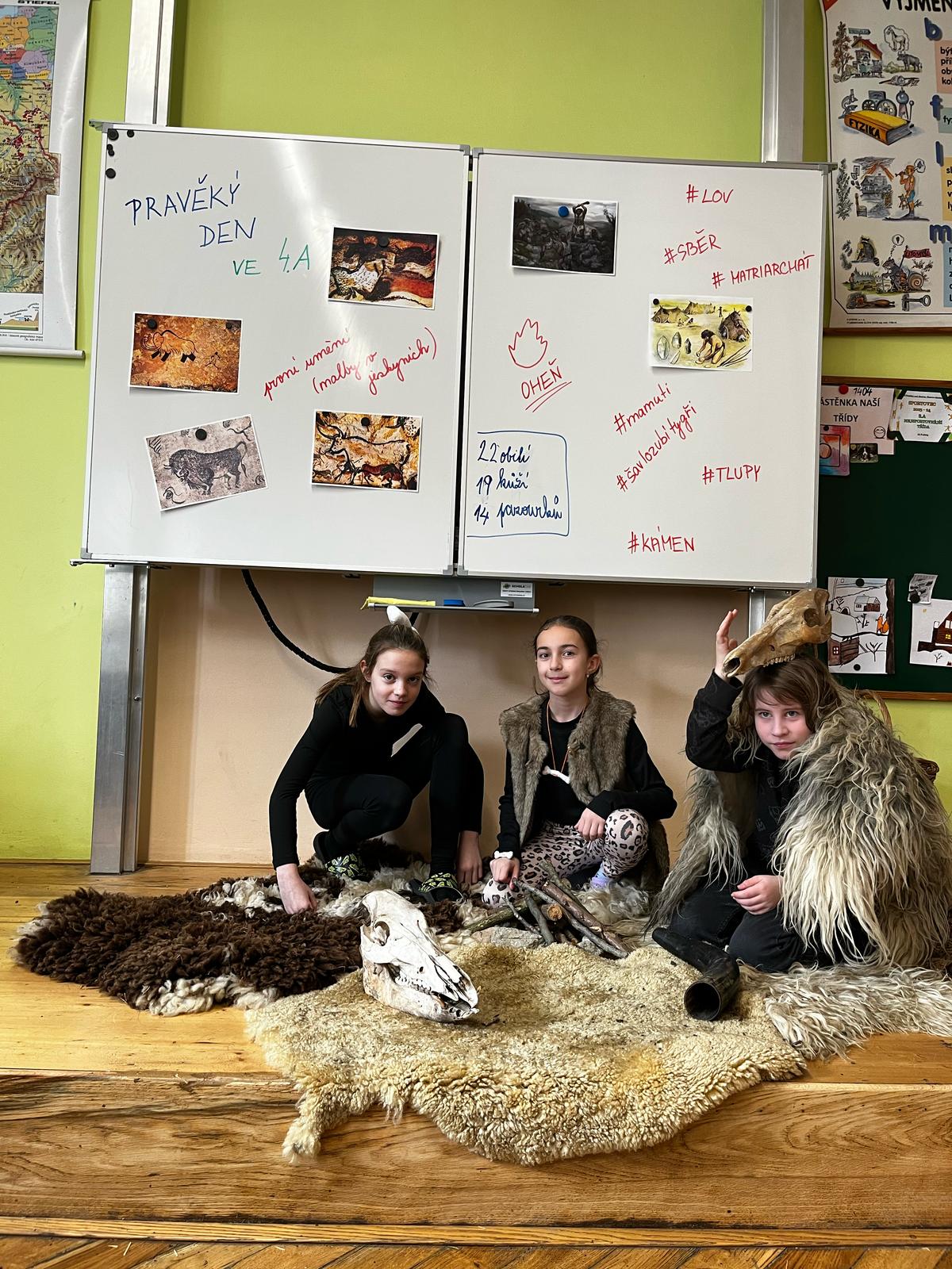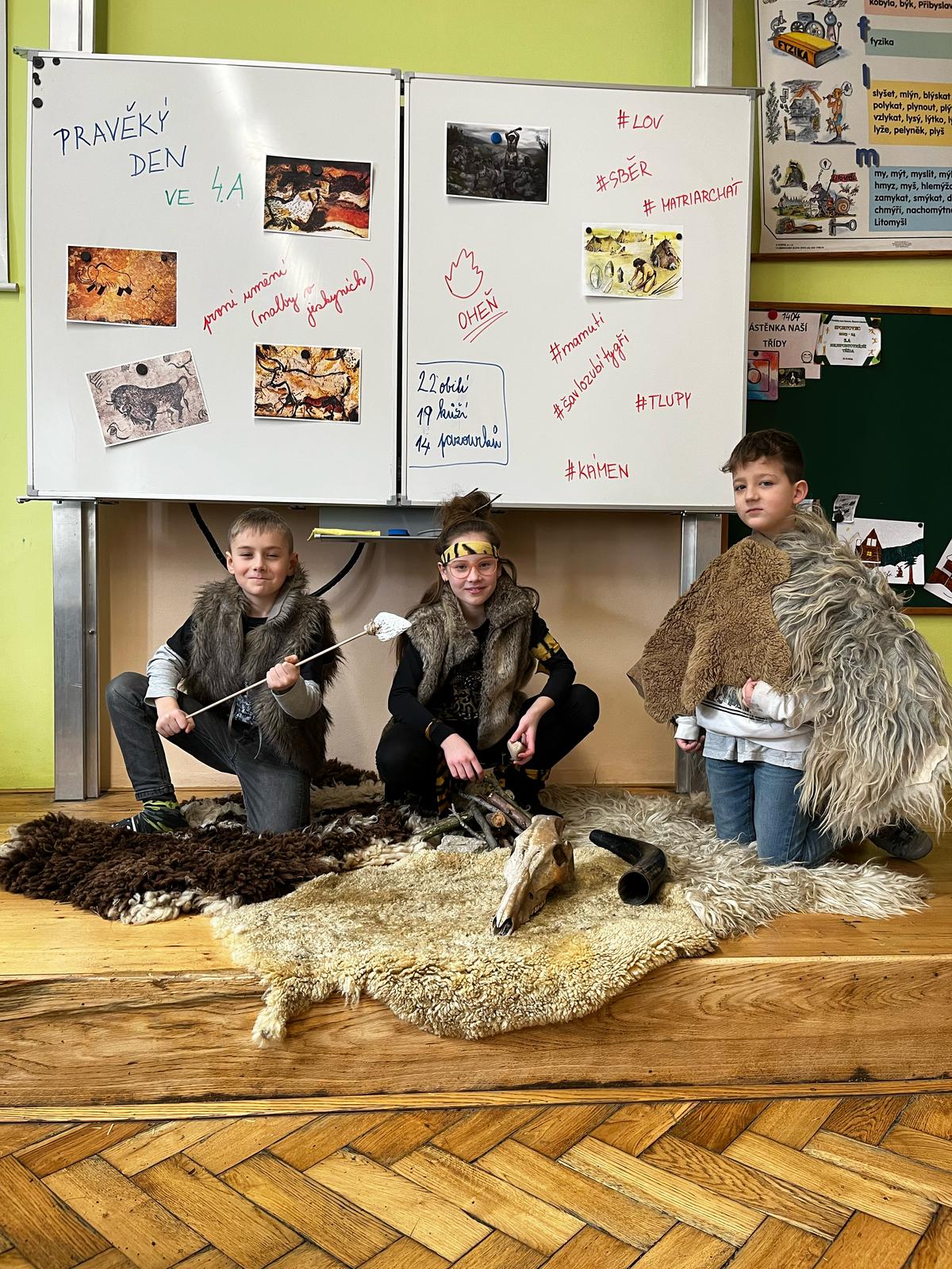V pondělí se žáci 4.A vrátili v čase a vydali se do dalekého PRAVĚKU. Ve svých skupinách se snažili při plnění různých úkolů nashromáždit dostatek surovin pro přežití jejich tlupy. Všichni se do projektu zapojili nejen skvělými kostýmy, ale i spoluprací ve své tlupě.