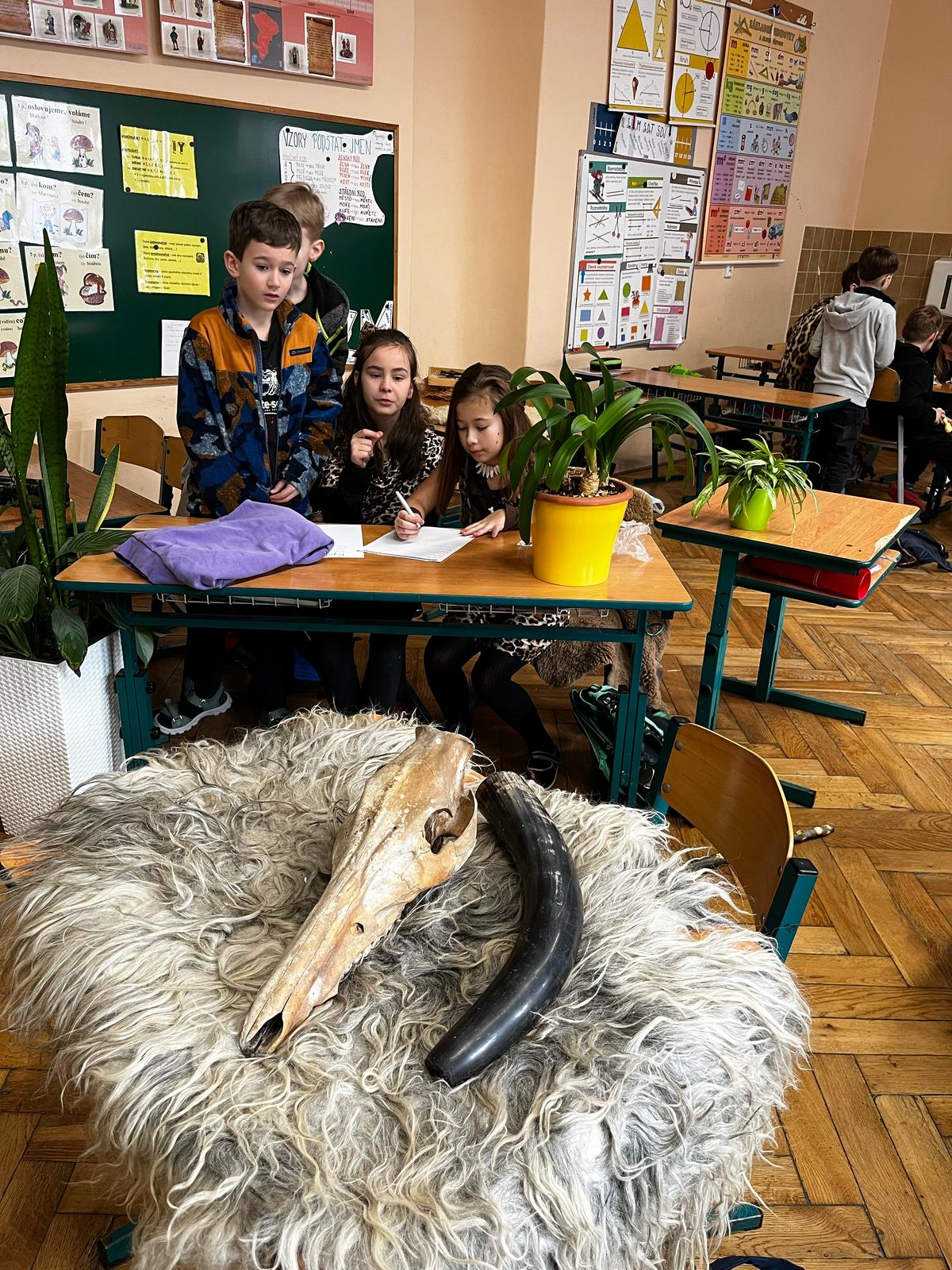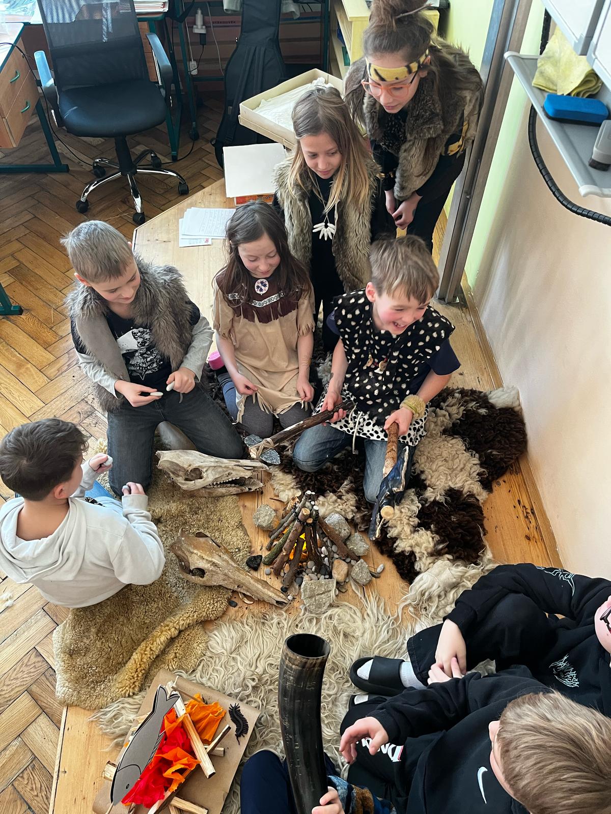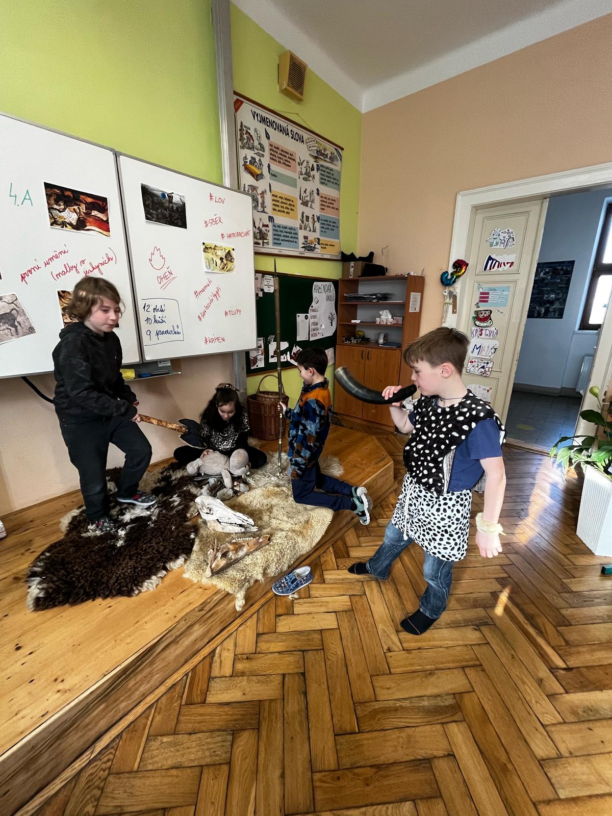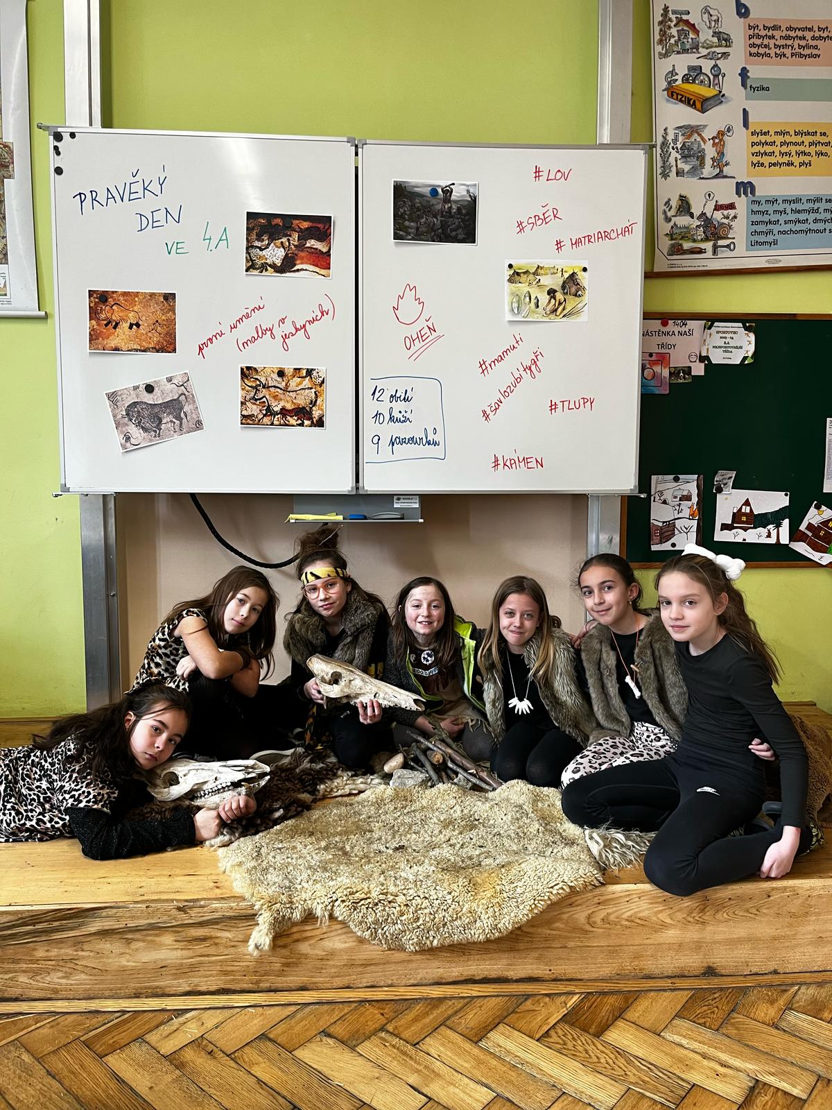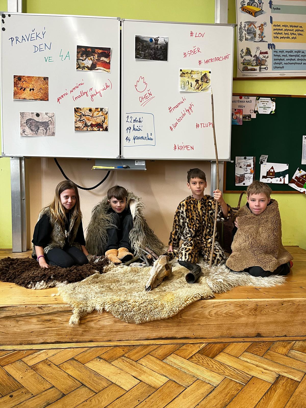V pondělí se žáci 4.A vrátili v čase a vydali se do dalekého PRAVĚKU. Ve svých skupinách se snažili při plnění různých úkolů nashromáždit dostatek surovin pro přežití jejich tlupy. Všichni se do projektu zapojili nejen skvělými kostýmy, ale i spoluprací ve své tlupě.