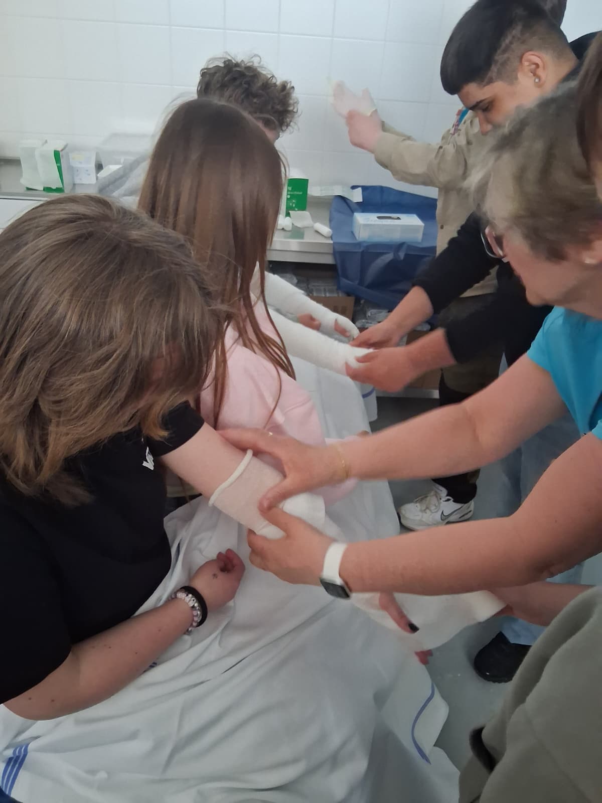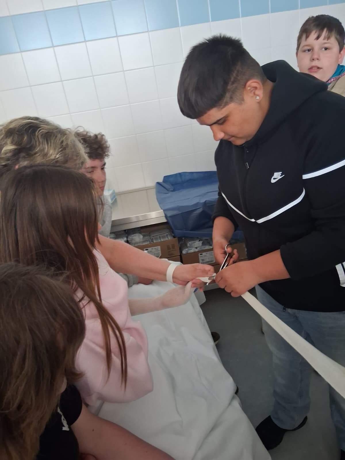 Druhé skupině se mezitím věnovaly dívky ze střední zdravotnické školy, seznámily nás se svou školou a s tím, jak funguje. Měřili jsme si tlak a saturaci kyslíku, odebírali krev a aplikovali inzulin, obojí pomocí gumové makety. Nakonec jsme si naše znalosti ověřili soutěží na Kahootu. Skupiny se prostřídaly, a tak nikdo o nic nepřišel.