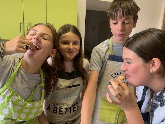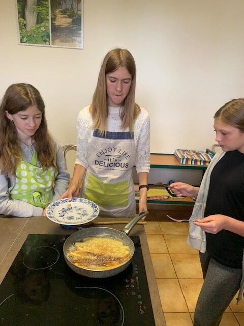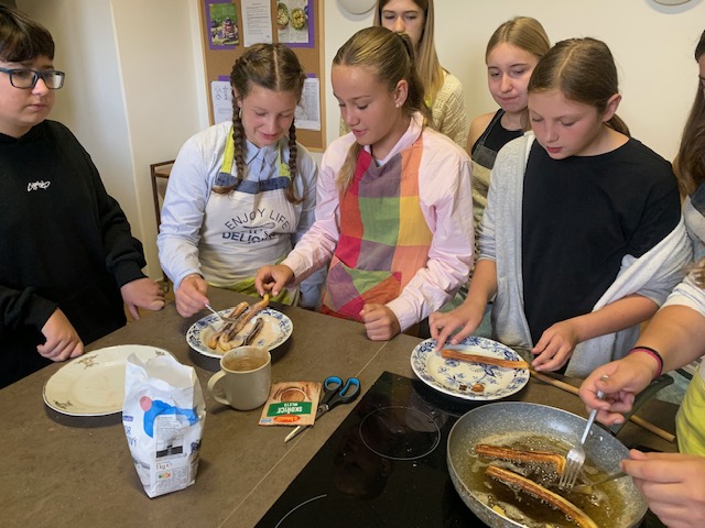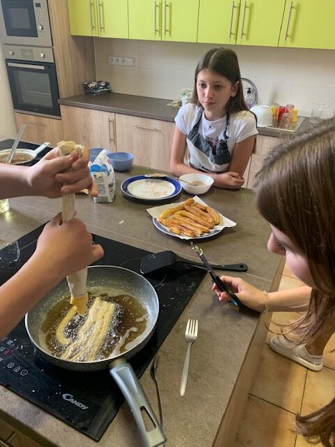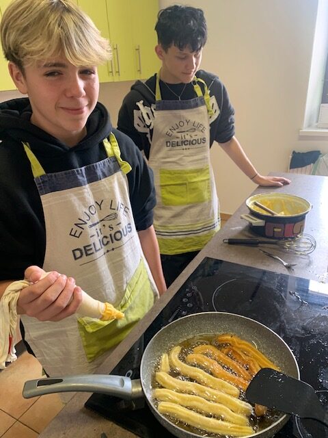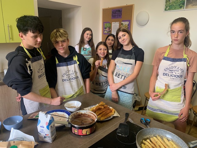 Protože jsme v červnu v rámci lekce o jídle a pití neměli čas na oblíbený recept, zpříjemnili jsme si hodinu španělštiny vařením tento týden. Každá skupina osmáků si usmažila svoje “churros” a umíchala výbornou “chocolate”.